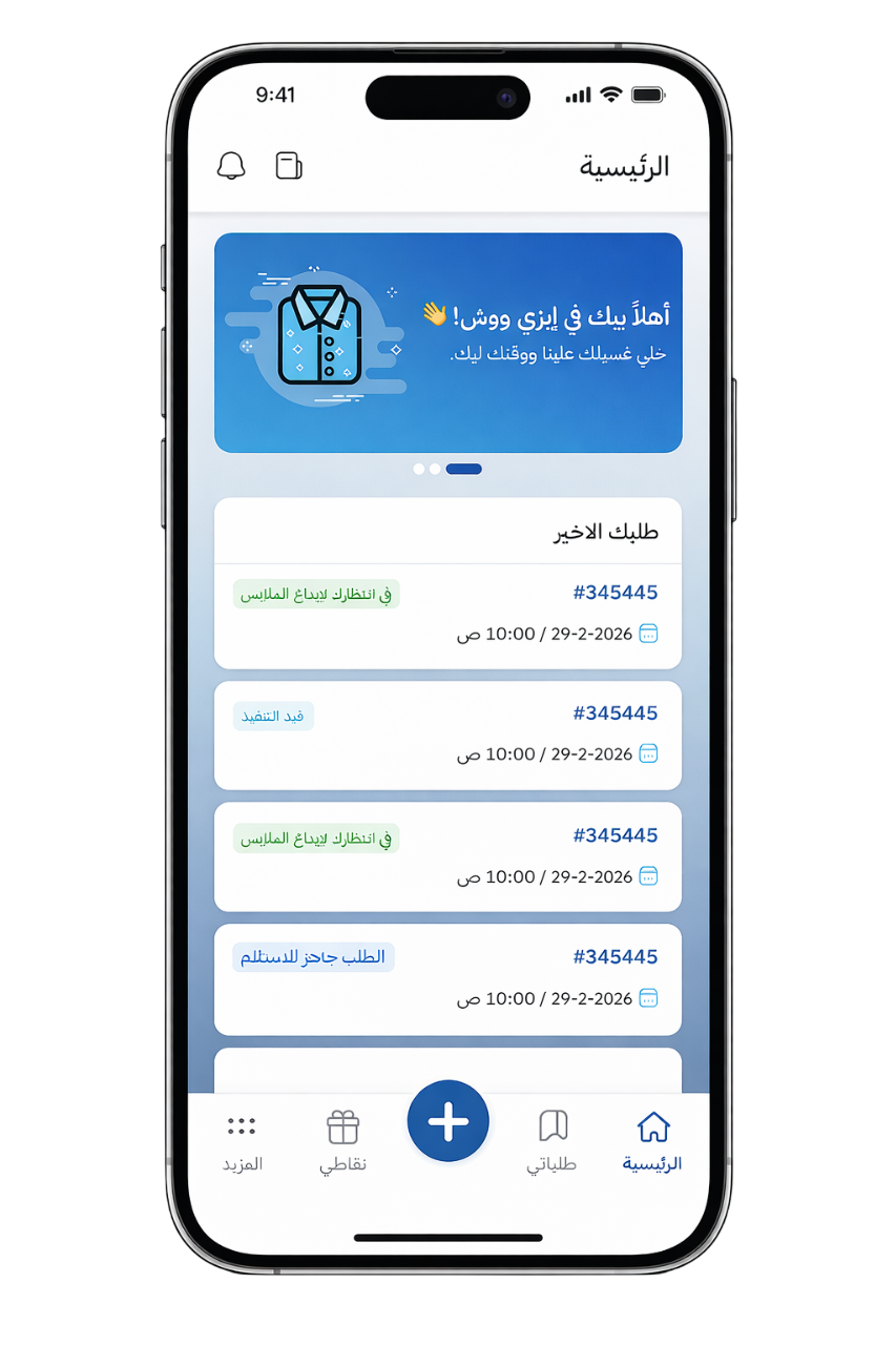اختر نوع الخدمة، حدد وقت الاستلام، ودع فريق إيزي ووش يهتم ببقية التفاصيل.